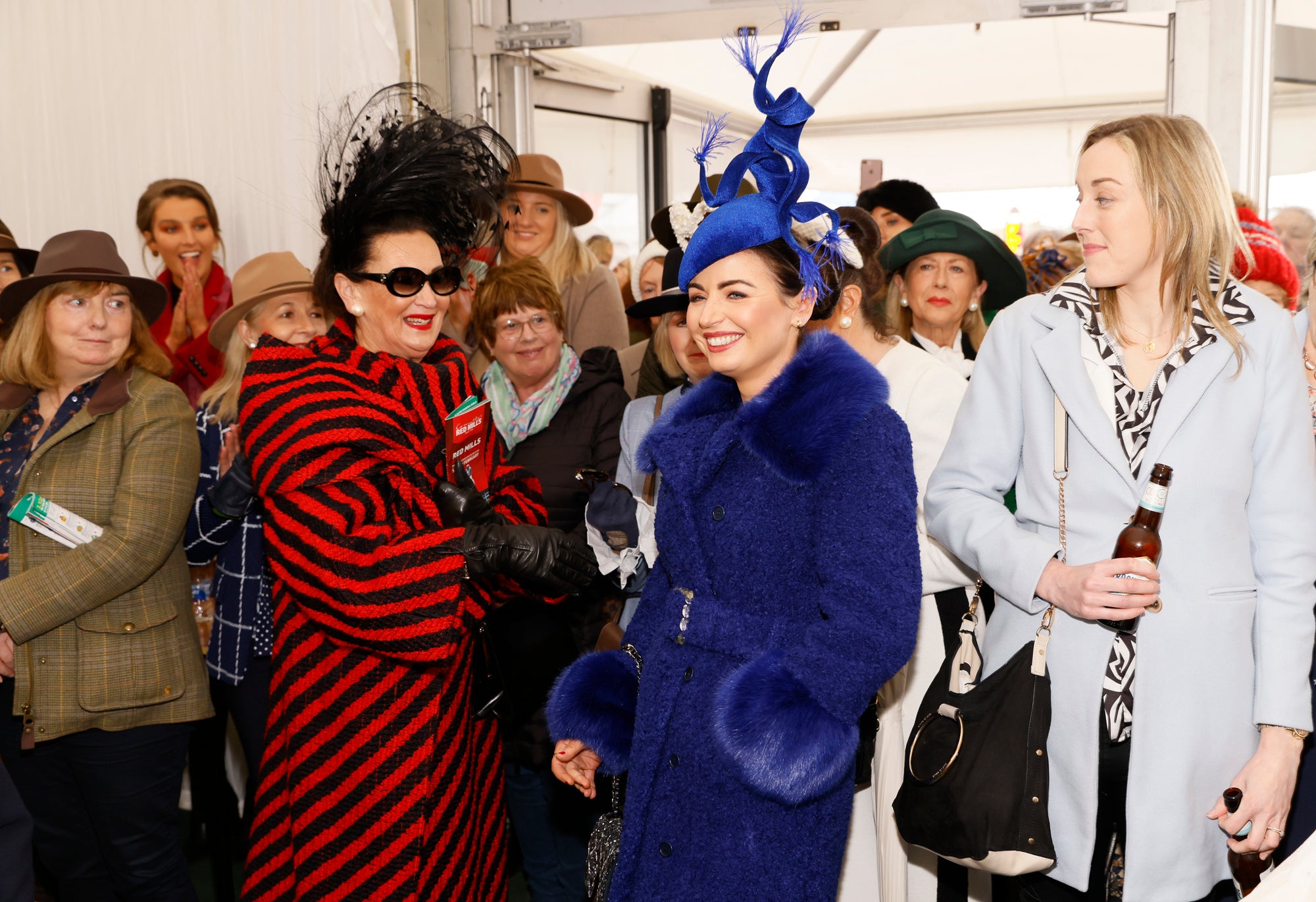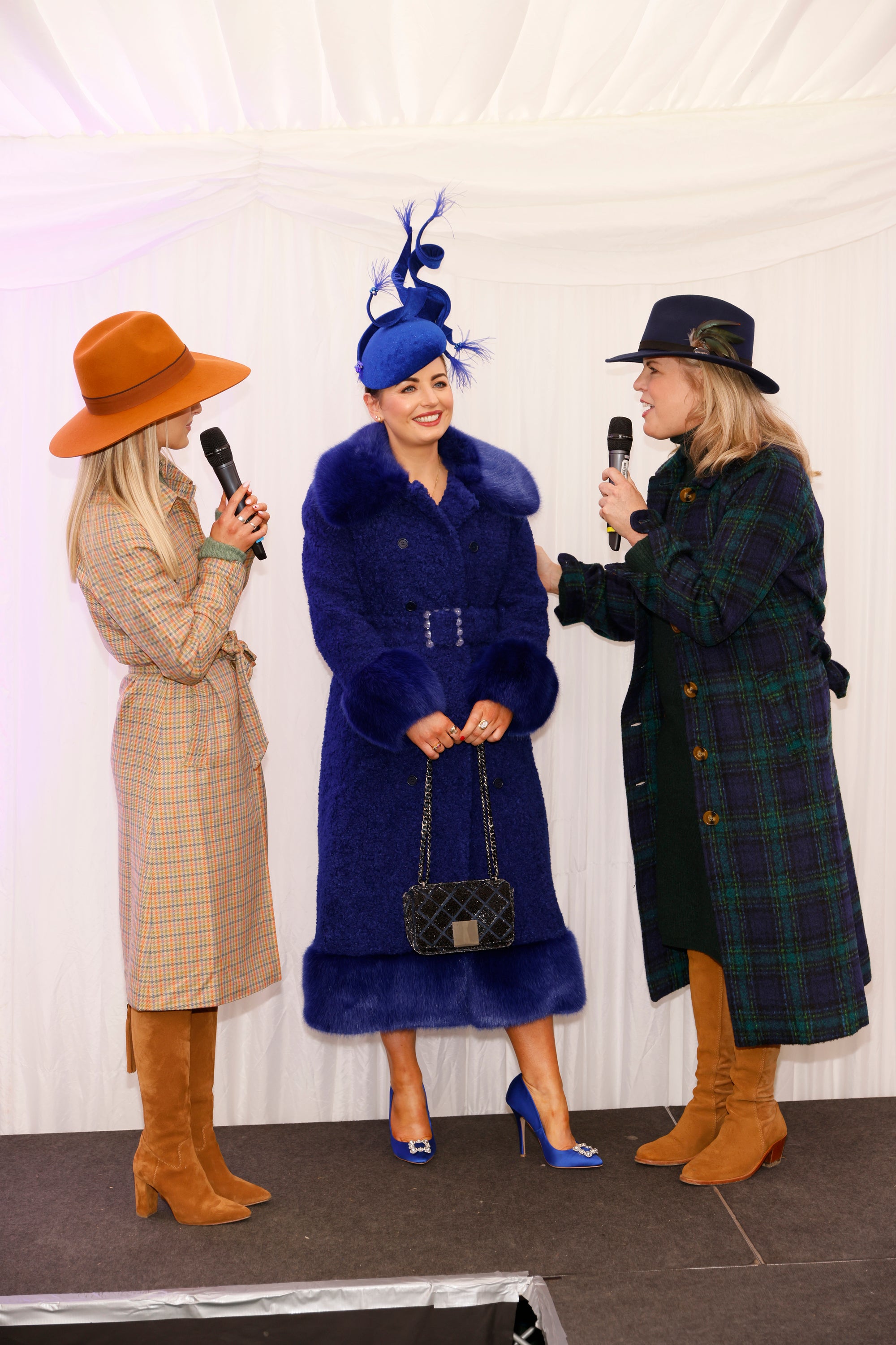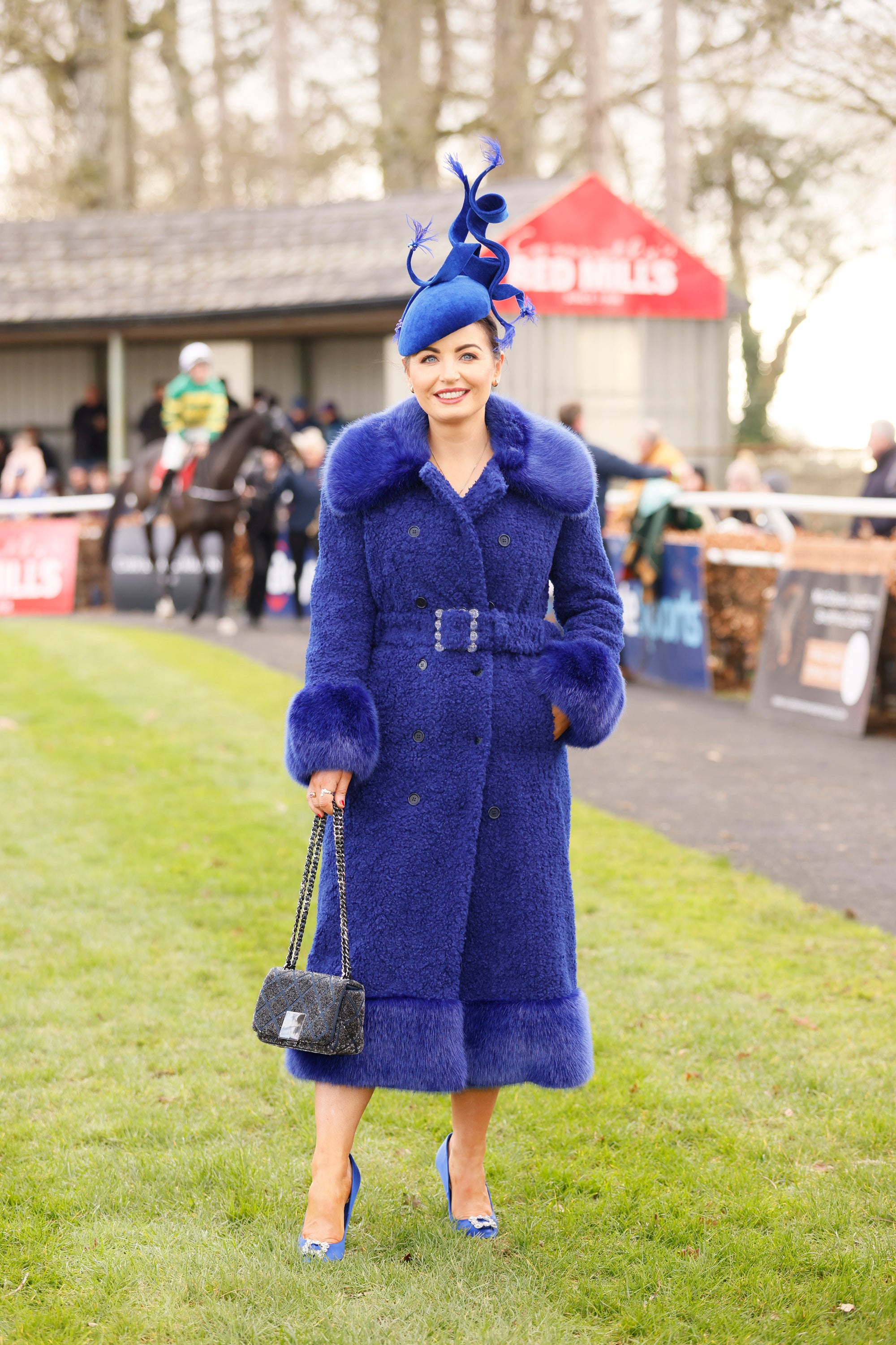 Wearing a showstopping electric blue coat from Shrimp London which was a Christmas gift from her mother during the pandemic, Sarah chose Red Mills Day at her local track as the first outing for the coat. She paired this with a velvet dress from Serendipity boutique in Kilkenny, a headpiece from Marc Millinery, and ‘Sex in the City’ inspired shoes from Arnotts. Sarah impressed both Nathalie and fellow judge, stylist Marietta Doran with her stunning choice of colour and fabric textures, with a unique mix of velvet, wool, fur, satin and a touch of bling.